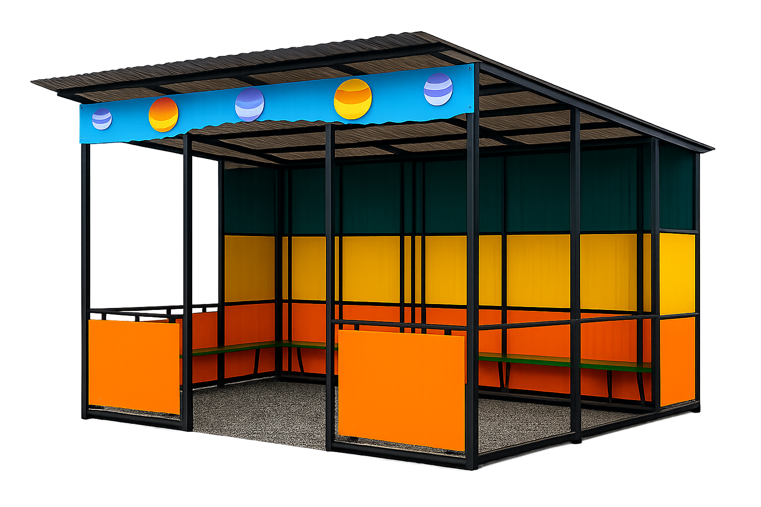 Яскравий дизайн павільйону створює привабливу атмосферу для дітей і гармонійно доповнює сучасні дитячі майданчики.